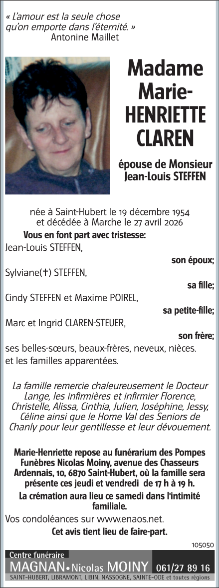 Avis de décès de Madame Marie-Henriette CLAREN