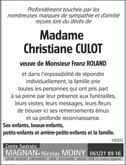 Décédée à Saint-Hubert (6870) le mardi 6 juin 2023 à l'âge de 95 ans