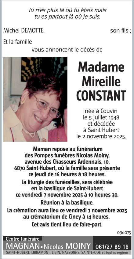 Décédée à Saint-Hubert (6870) le mercredi 5 novembre 2025 à l'âge de 77 ans