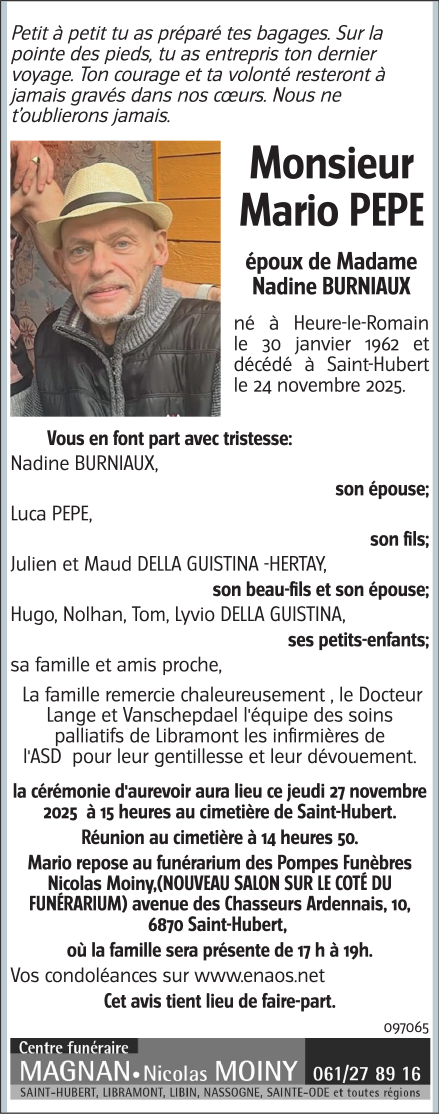 Décédé à Saint-Hubert (6870) le lundi 24 novembre 2025 à l'âge de 63 ans