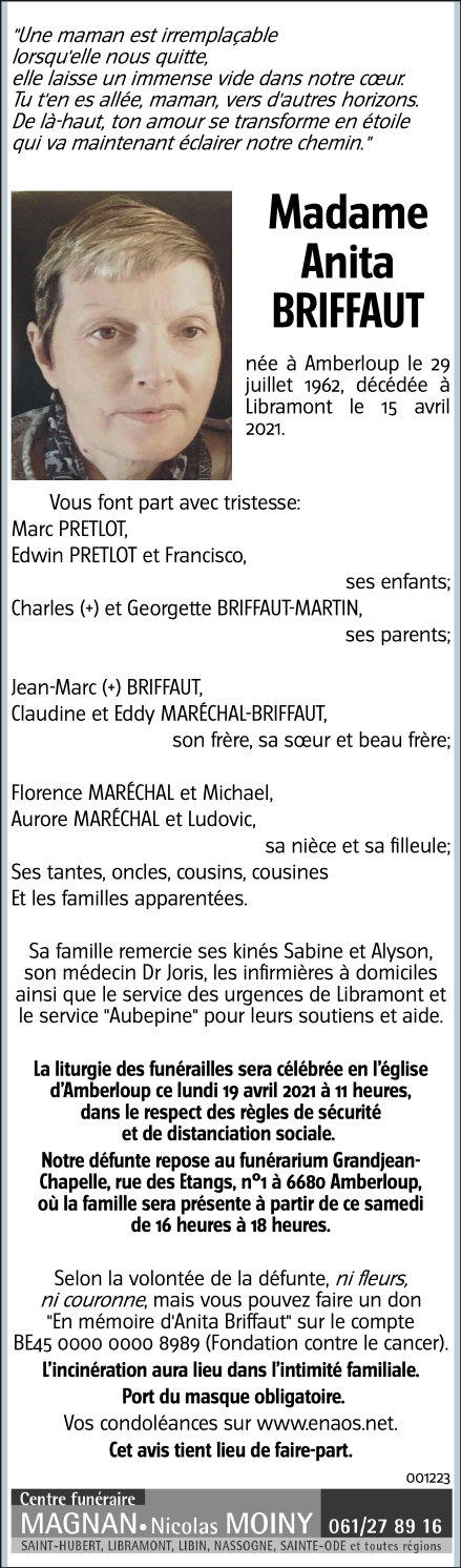 Décédée à Libramont (6800) le jeudi 15 avril 2021 à l'âge de 58 ans