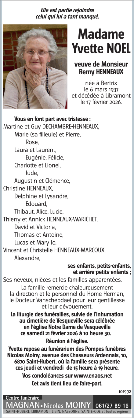 Décédée à Libramont (6800) le mardi 17 février 2026 à l'âge de 88 ans