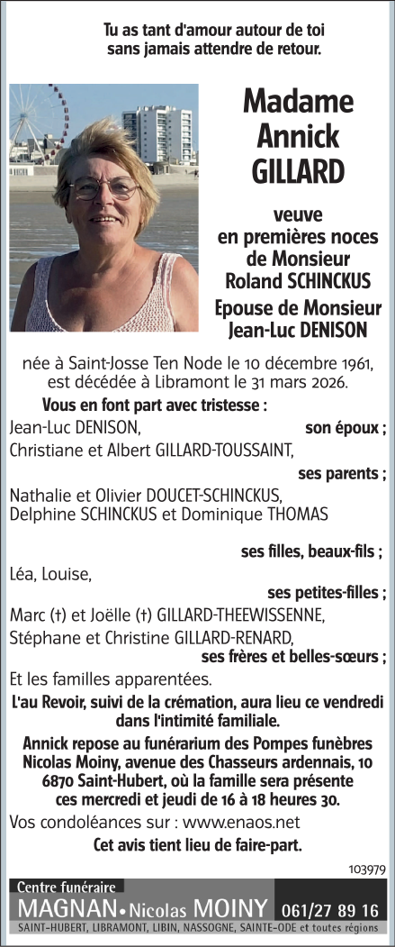 Décédée à Libramont (6800) le mardi 31 mars 2026 à l'âge de 64 ans