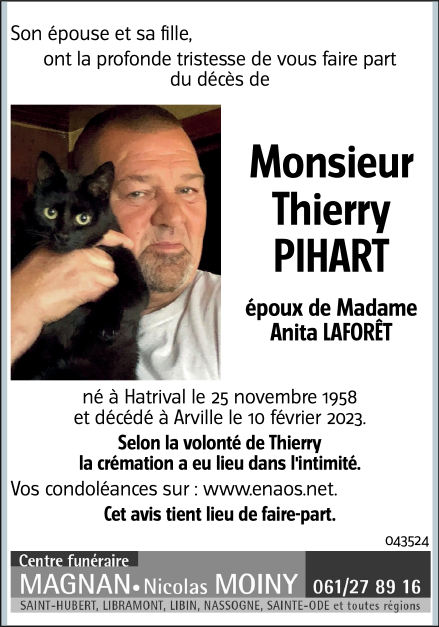 Décédé à Arville (6870) le vendredi 10 février 2023 à l'âge de 64 ans