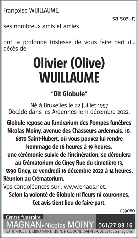 Décédé à Libramont (6800) le dimanche 11 décembre 2022 à l'âge de 65 ans