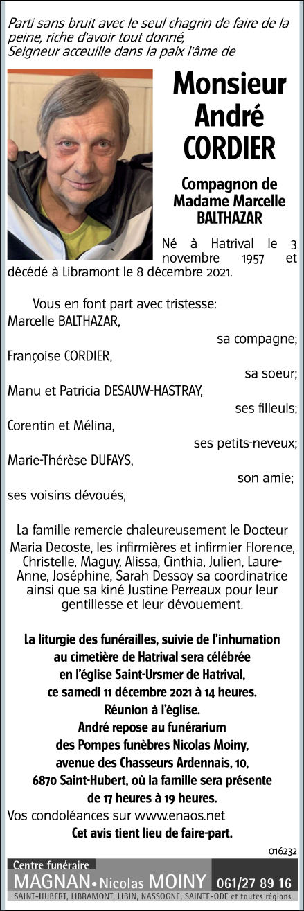 Décédé à Libramont (6800) le mercredi 8 décembre 2021 à l'âge de 64 ans