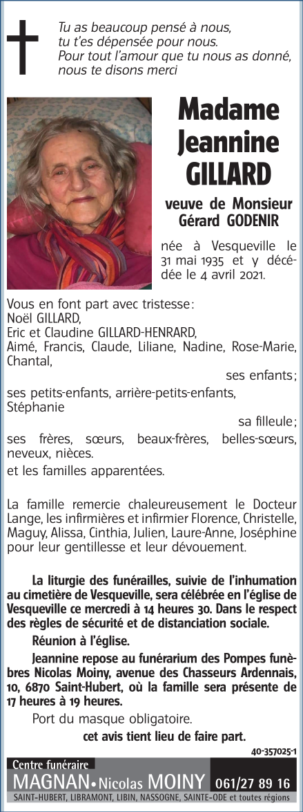 Décédée à Vesqueville (6870) le dimanche 4 avril 2021 à l'âge de 85 ans
