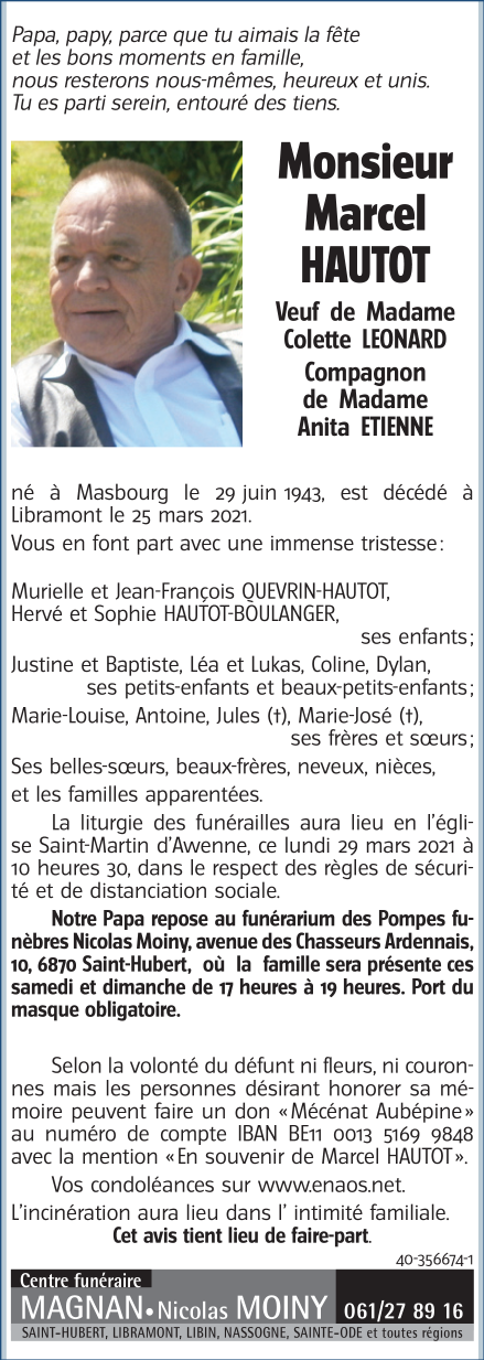 Décédé à Libramont (6800) le jeudi 25 mars 2021 à l'âge de 77 ans