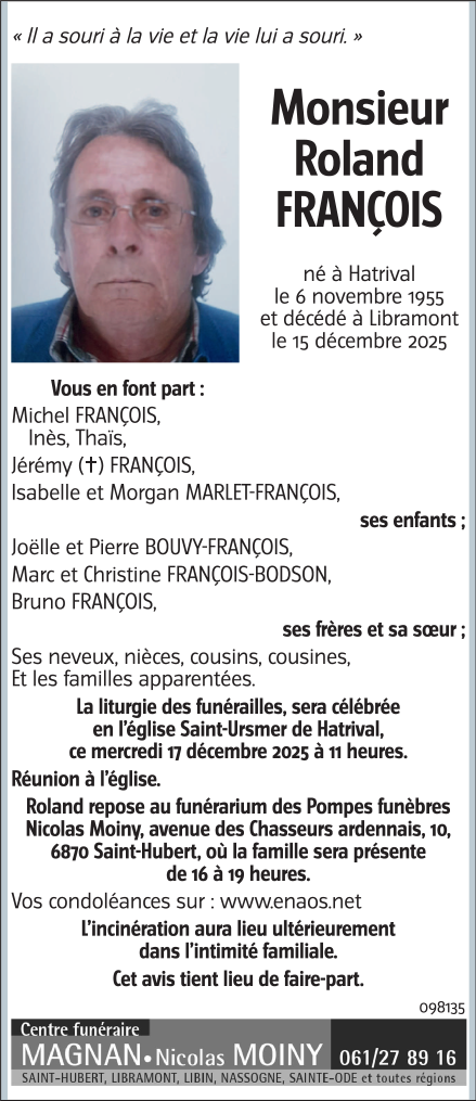 Décédé à Libramont (6800) le lundi 15 décembre 2025 à l'âge de 70 ans