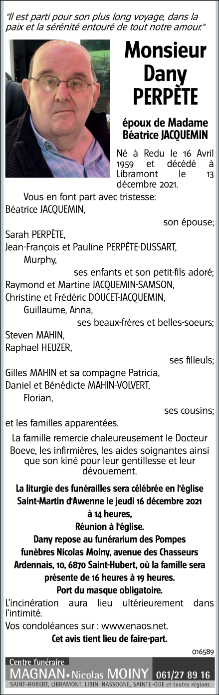 Décédé à Libramont (6800) le lundi 13 décembre 2021 à l'âge de 62 ans