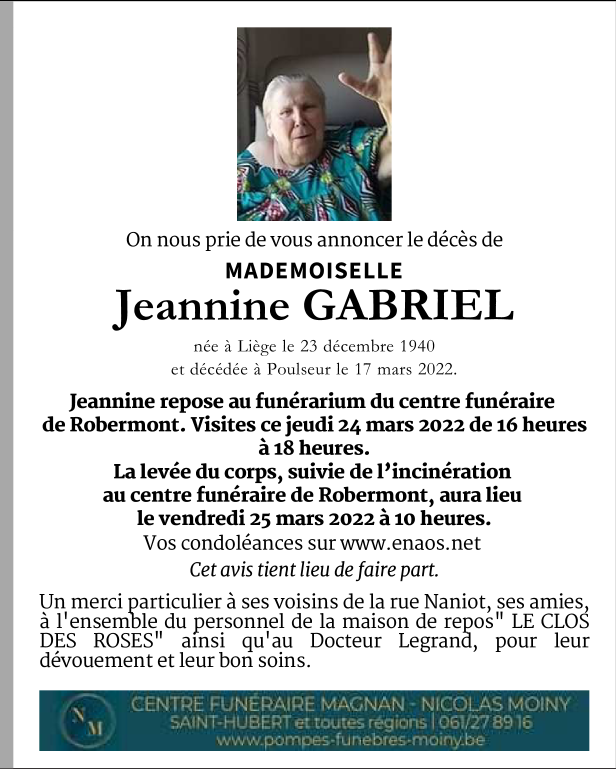 Décédée à Poulseur (4171) le jeudi 17 mars 2022 à l'âge de 81 ans