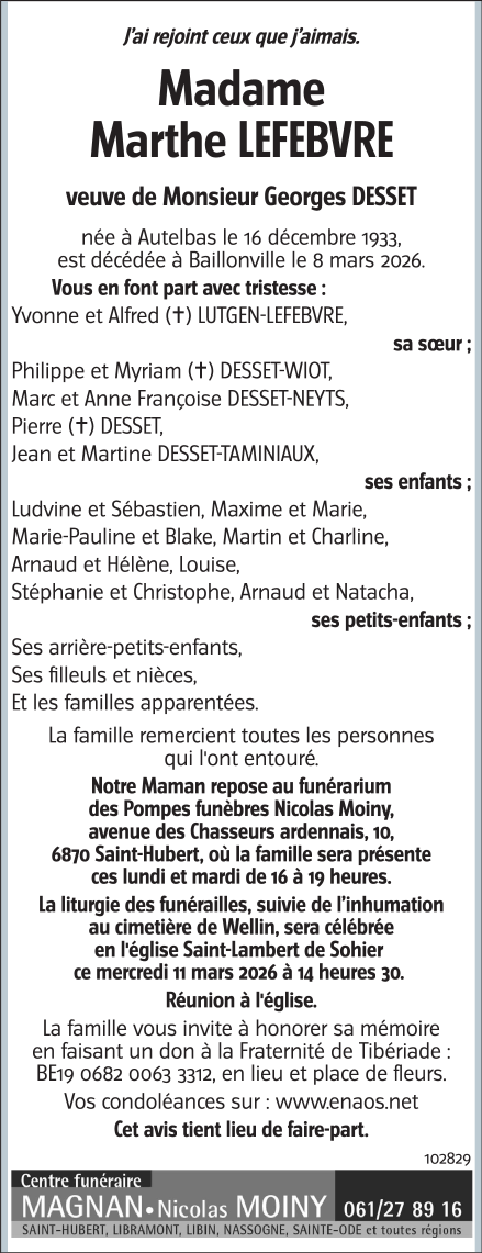 Décédée à Baillonville (5377) le dimanche 8 mars 2026 à l'âge de 92 ans