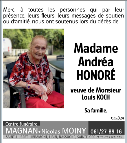 Décédée à Sainte-Ode (6680) le mardi 28 février 2023 à l'âge de 88 ans