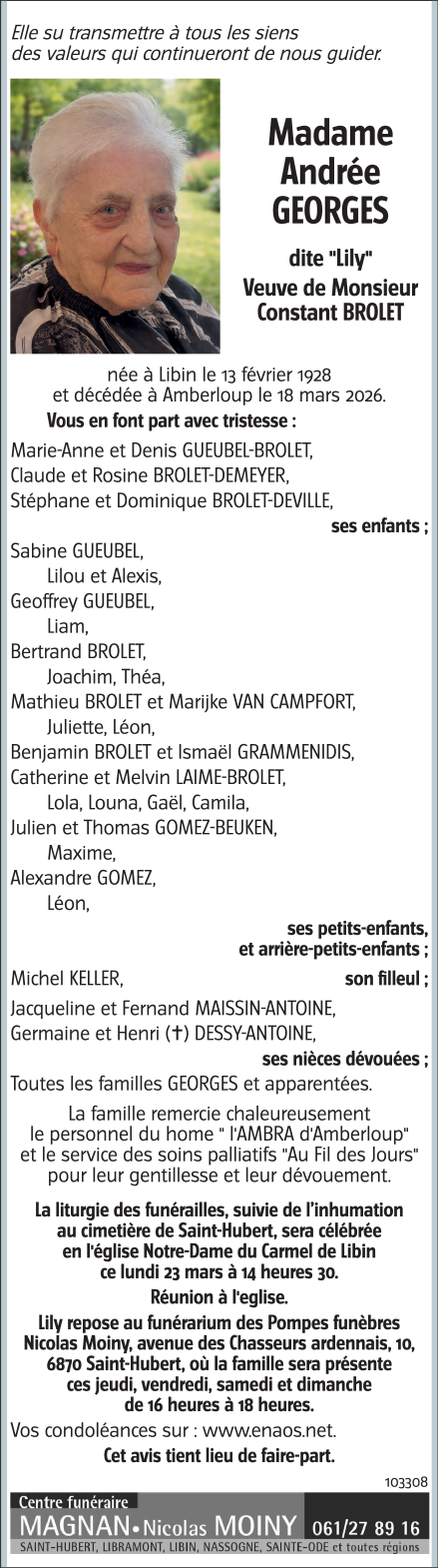 Décédée à Amberloup (6680) le mercredi 18 mars 2026 à l'âge de 98 ans