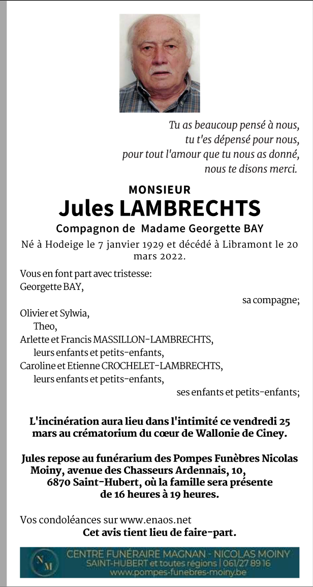 Décédé à Libramont (6800) le dimanche 20 mars 2022 à l'âge de 93 ans