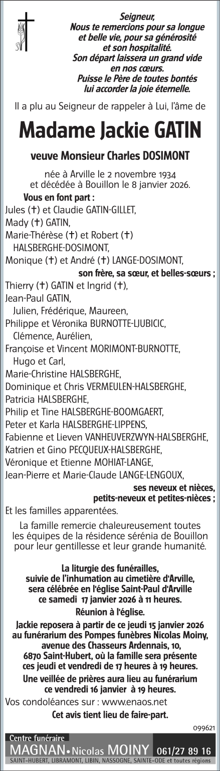 Décédée à Bouillon (6830) le lundi 12 janvier 2026 à l'âge de 91 ans