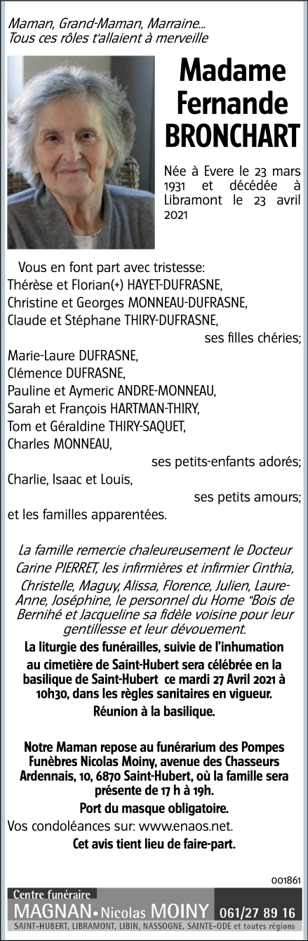 Décédée à Libramont (6800) le vendredi 23 avril 2021 à l'âge de 90 ans
