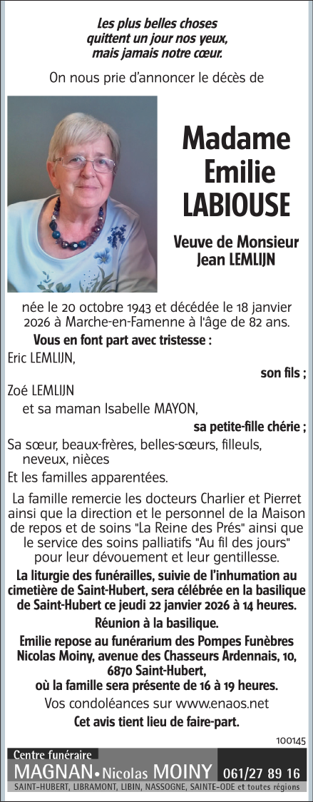 Décédée à Waha (6900) le lundi 19 janvier 2026 à l'âge de 82 ans