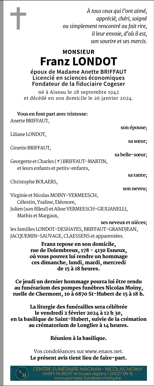 Décédé à Esneux (4130) le vendredi 26 janvier 2024 à l'âge de 81 ans
