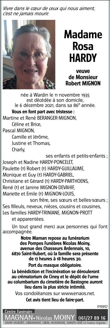 Décédée à Saint-Hubert (6870) le lundi 6 décembre 2021 à l'âge de 86 ans